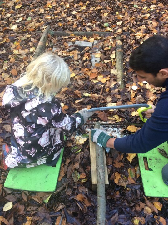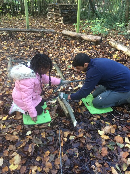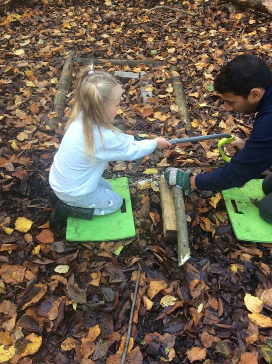 In Forest School lessons 1M have been learning how to use a bowsaw safely. A bowsaw is used to cut wood that is bigger than a two pence. 1M worked safely with Mr Mistry and Mrs Asghar to make a tree cookie!