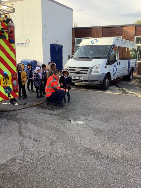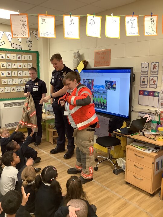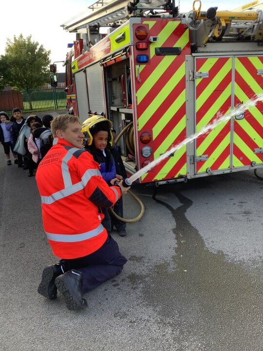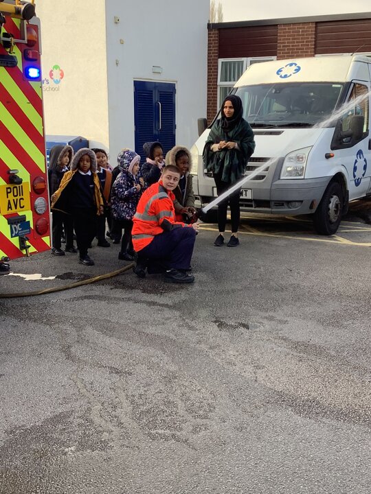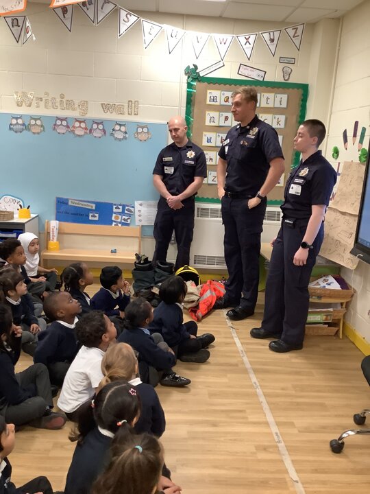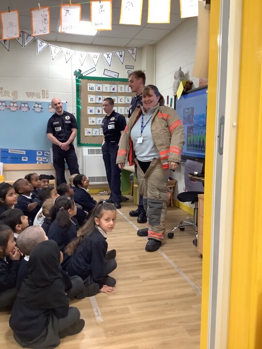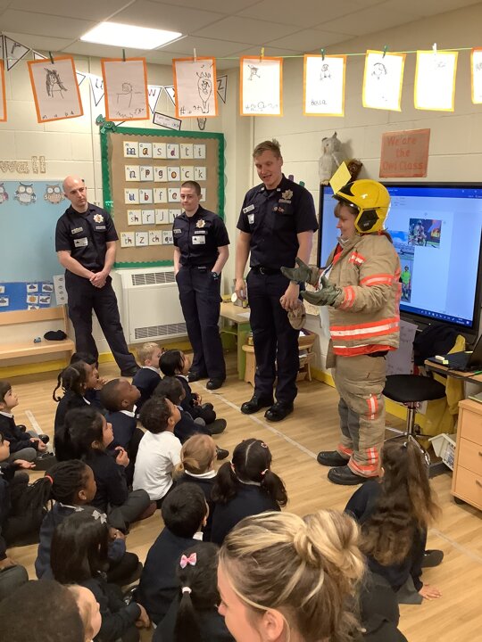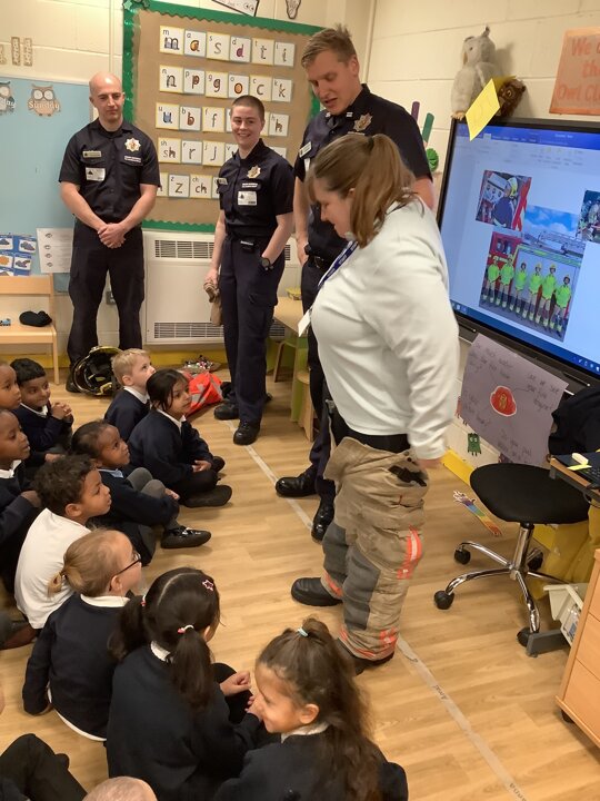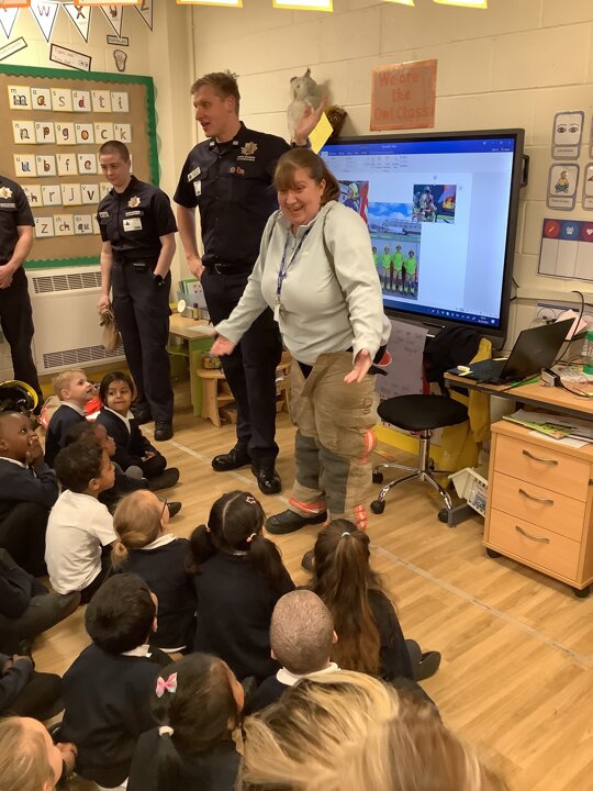 Reception had a visit from some lovely firefighters. They told us all about their job and showed us the equipment they need to wear to keep themselves safe when fighting a fire. They even dressed Miss Ainsworth up in their uniform which made us laugh. We had a look at the fire engine and the large amount of equipment which it carries. The emergency siren went off and so we got to see the lights and sirens working which made us very excited.