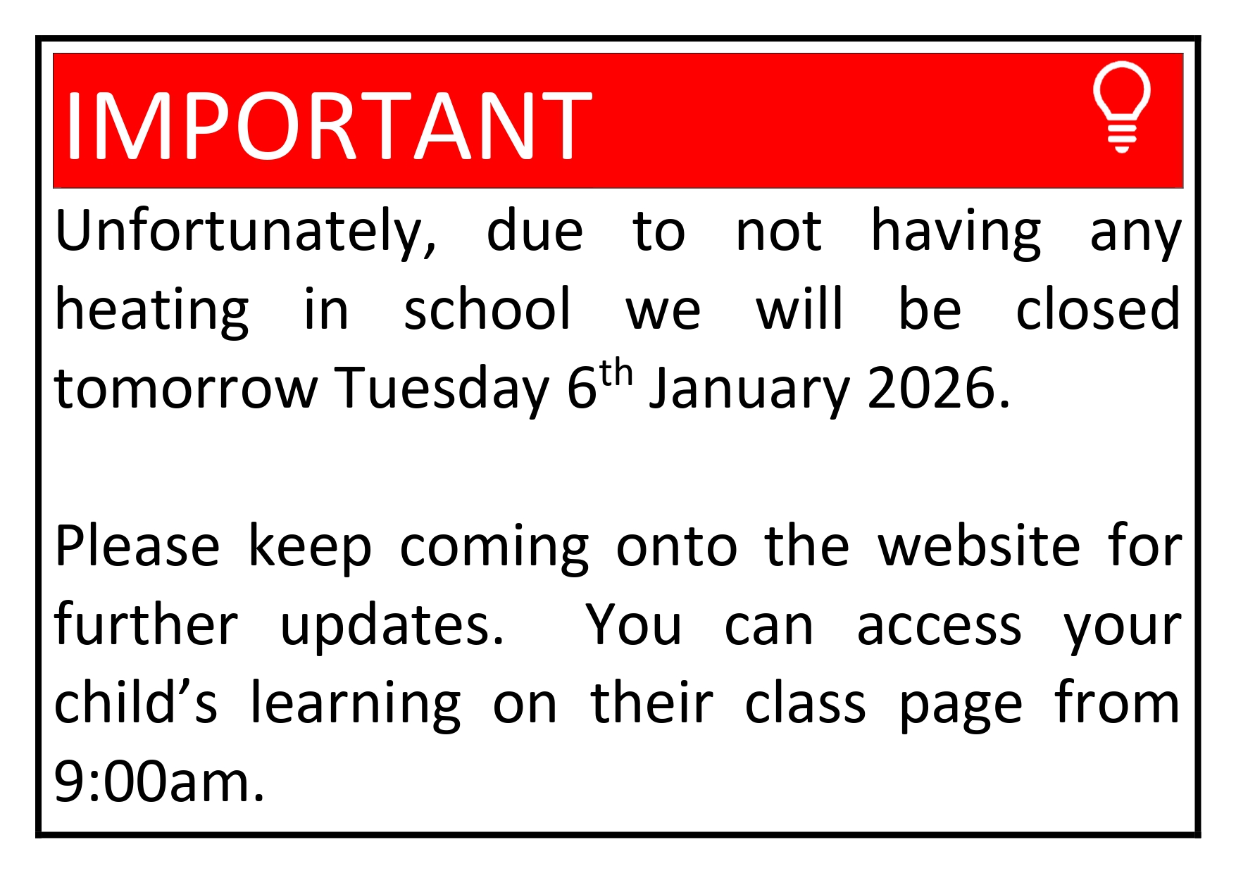 School is closed tomorrow Tuesday 6th January 2026 - Due to not having any heating